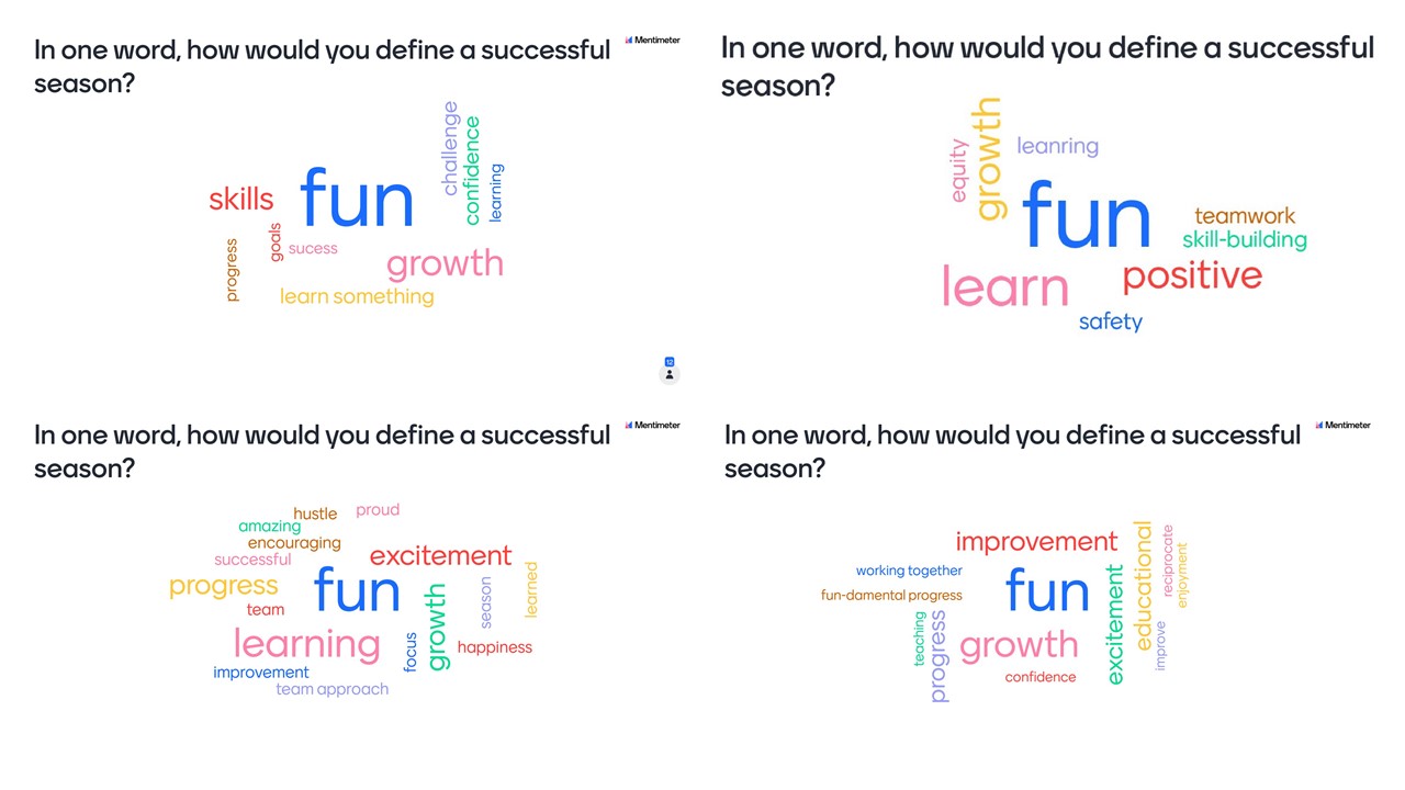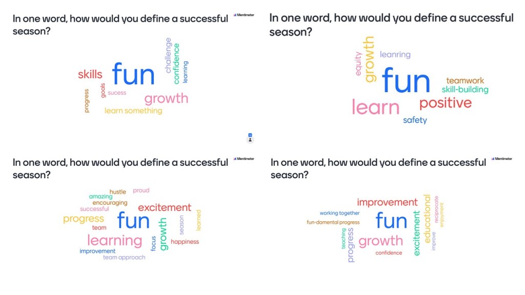 Notice anything? The same word is the largest in the center of all of the word clouds – FUN. I think this is fantastic. The next largest (and therefore most often answered) words are things like growth, learn(ing), progress, and excitement. And don’t think I didn’t geek out with the ‘hustle’ response! Anyway, these results fit exactly with my definition of a successful season; i.e. the athletes have fun, learn to play the game and improve throughout the season. My ultimate measure of success is whether the child decides to play again the following season.