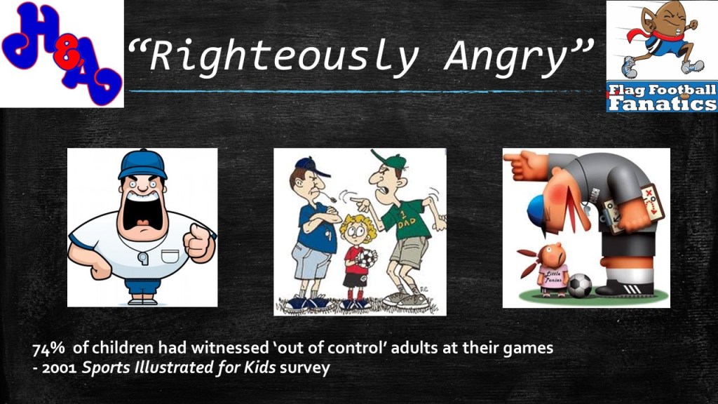 In my coaching clinics, I show the slide above. The voice track is about when I was asked a while ago, “What makes me righteously angry?” My response was that I get righteously angry when a child stops playing youth sports because of a bad experience with an adult. Notice the statistic from a 2001 Sports Illustrated for Kids survey: 74% of the children surveyed had witnessed ‘out of control’ adults at their games. What is most concerning to me – and one of the reasons I started this blog and offer coaching clinics – is when the adult behaving badly is a coach.