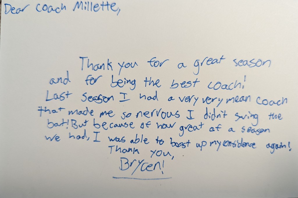 Wow… a handwritten note! Brycen points out how important the coach is to a player’s decision to continue to play. Another season with a coach that made him afraid to swing the bat and Brycen might have decided not to play baseball again. My ultimate measure of a successful season is if the players want to play again the following season. Not only did Brycen come back the next season, he and his parents also requested to play on the team I coached.